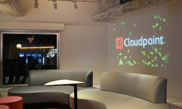 壁面に設置した Cloudpoint のロゴパネルには、プロジェクションマッピングを常設投射しています。