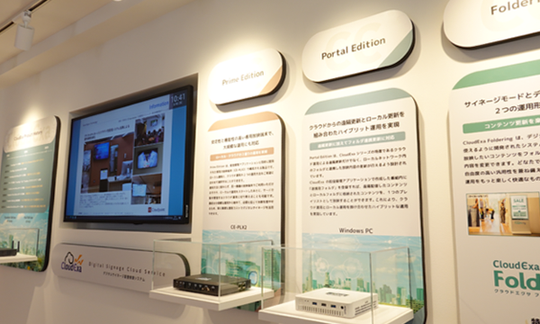 続いて、自社開発をしているデジタルサイネージ配信システム「CloudExa」の専用ブースです。
