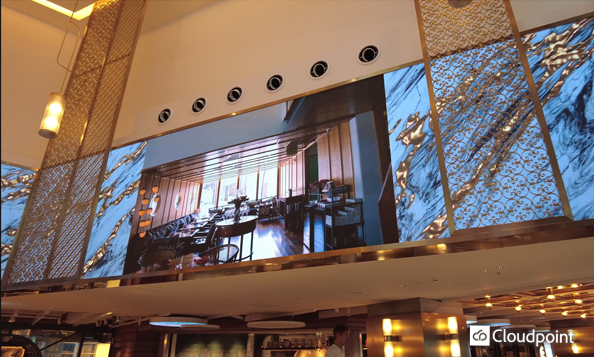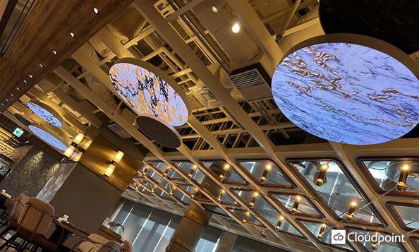 メインダイニングの天井に設置された天吊りの丸型LEDビジョンには、ゆるやかに変化する大理石模様のコンテンツを放映することで、